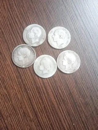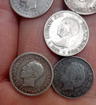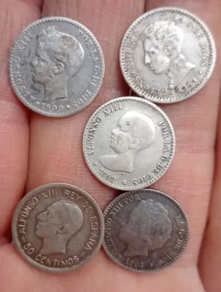 Set di cinque monete da 50 centesimi in argento di Alfonso XIII. - Una moneta del 1900. - Una moneta del 1892. - Una moneta del 1894. - Due monete con l'anno non visibile.