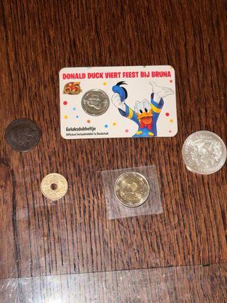 Set di monete antiche e da collezione. - Una moneta commemorativa di Paperino. - Una moneta con foro centrale da 25 pesetas. - Una moneta d'argento. - Una moneta di bronzo.