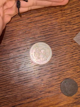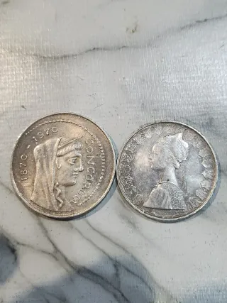 Set di due monete antiche in argento. Una moneta con l'iscrizione 1870 CONCORDIA. Un'altra moneta con il profilo di una figura femminile.