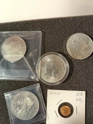 Set di monete d'investimento. LOTE INDIVISIBILE - 1 Oncia d'argento con design albero della vita, 2022 - 3 Once d'argento Filarmonica, anni 2022-2023 - Moneta da 2 Pesos Messicani, 1920, 21K, 1,66g. Anno difficile da trovare. Accetto pagamenti tramite wallapop, contanti e criptovalute. Tutte le monete sono in buono stato, con macchie o usura naturale.