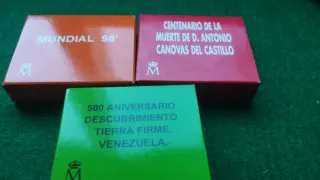 Set di tre monete d'argento, ciascuna con il suo protettore individuale. - Moneta di 1000 mondial 98 - Moneta 500 anniversario Tierra Firme - Moneta Centenario Morte di D. Antonio Cánovas del Castillo