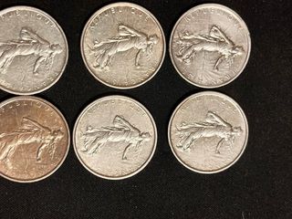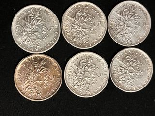 Set di sei monete francesi da 5 franchi, coniate in argento. Ogni moneta presenta un design dettagliato con motivi vegetali e il motto Liberté, Égalité, Fraternité. Dettagli: - Monete da 5 Franchi Francesi. - Materiale: Argento. - Anni: 1960, 1961, 1962, 1963, 1964, 1965.