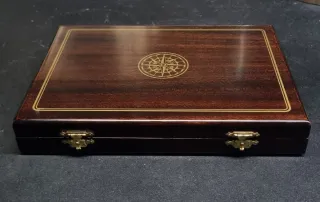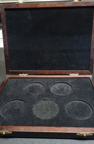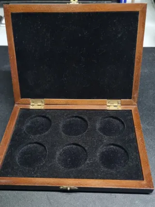 Elegante astuccio in legno scuro con dettagli dorati, ideale per conservare monete o once d'argento. Design con figura centrale e stelle. Chiusura metallica dorata. 6 scomparti da 45mm.