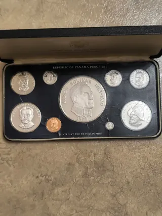 Set di 9 monete in qualità PROOF della Repubblica di Panama, coniate da The Franklin Mint. Contiene 3 monete in argento 925mm. Le altre sono in lega rame/nichel: - 20 Balboas. SIMON BOLÍVAR. Peso 129,59gr. (3,85 once). Diametro 61 mm - 5 Balboas. BELISARIO PORRAS Peso 34,60 gr (1,11 once). Diametro 39 mm - 1 Balboa. VASCO NÚÑEZ DE BALBOA. Peso 26,60 gr (0,86 once). Diametro 38 mm. TOTALE ARGENTO 190,79 gr. (5,82 once) Il set viene fornito con custodia e certificato di autenticità. SPEDIZIONE CERTIFICATA GRATUITA FUORI WALLAPOP