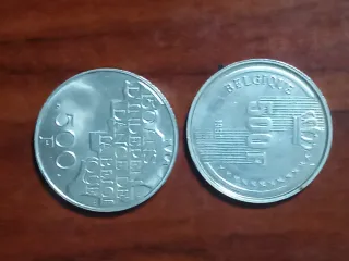 Set di due monete belghe da 500 franchi. Insieme pesano un'oncia di argento puro. Vendute a prezzo inferiore al valore spot. Acquistate all'asta, autenticità garantita. - Una moneta con Belgique e 500 F. - Un'altra moneta con Belgique, 500 F e l'anno 1990.
