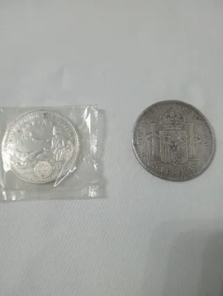 Set di due monete d'argento. - Una moneta commemorativa. - Un'altra moneta con stemma e valore di 5 pesetas.