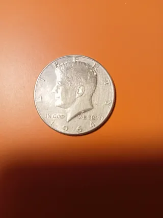 Moneta da mezzo dollaro americano con il ritratto di John F. Kennedy. Metallo: Argento IN GOD WE TRUST inciso - Moneta da 1/2 Dollaro Statunitense in argento JFK del 1964. -silver 90% argento; 10% rame; -contorno rigato; -diametro 30.6 mm -spessore 2.15 mm -peso 12,50 gr. Commemorativa Kennedy - La moneta raffigurata è un Kennedy Half Dollar (mezzo dollaro Kennedy), un mezzo dollaro statunitense con l'effigie di John F. Kennedy, emesso a partire dal 1964. Quella raffigurata è una moneta da mezzo dollaro Kennedy del 1964, l'unico anno in cui questa moneta fu coniata con una composizione in argento al 90%. veduto e piaciuto