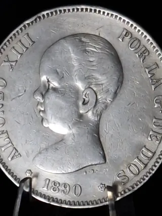Moneta commemorativa di Alfonso XIII. - Anno: 1890 - Iscrizione: ALFONSO XIII PER LA GRAZIA DI DIO - Design: Ritratto di Alfonso XIII di profilo.