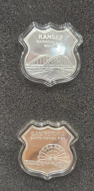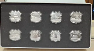Collezione completa di 8 once Route 66. Contiene astuccio esposizione che rappresenta una targa.