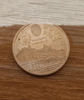 Moneta commemorativa da 2.000 peseta dell'anno 1995. Prodotta in argento. Design con l'edificio della Presidenza del Consiglio dell'UE. Include l'emblema dell'UE e l'anno 1995.