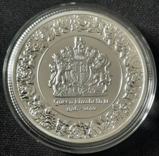 Medaglia commemorativa in argento 400 raffigurante il profilo della Regina Elisabetta II. - Bordo decorato con rose. - Incisione QUEEN ELIZABETH II 1926-2022.