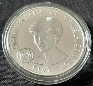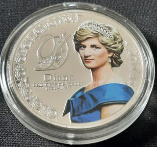 Medaglia commemorativa in argento 400 dedicata alla Principessa Diana. - Ritratto della Principessa Diana con diadema e abito blu. - Decorazione floreale con rose e monogramma D. - Testo Diana Princess of Wales 1961-1997.