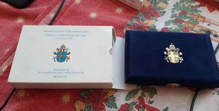 Set di due monete in argento del Vaticano. - Dritto: CITTA DEL VATICANO, figura di donna con drappeggio, 1999, R, L.10000. - Rovescio: CITTA DEL VATICANO, VERSO L'ANNO SANTO DEL 2000, 1999, R, L.10000, gruppo di figure. - Materiale: Argento.