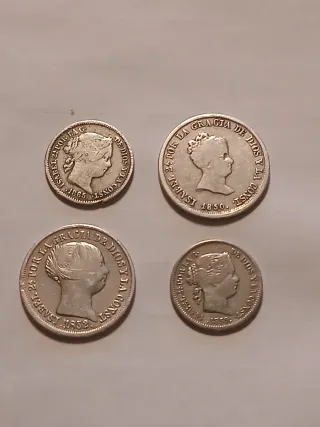Lotteria di quattro monete di Isabel II in argento. - una da un Real 1859. - due da due Reales 1850 e 1852. - una da 10 centesimi di scudo 1865. Buono stato generale. Consegna a mano a Madrid. Possibilità di spedizione certificata. Assoluta serietà.