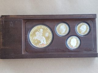 Set di quattro monete d'argento con diversi design. - Moneta 1: Profilo di re con iscrizione. - Moneta 2: Profilo di re con iscrizione e anno. - Moneta 3: Profilo di re con iscrizione e anno. - Moneta 4: Figura con iscrizione e anno.