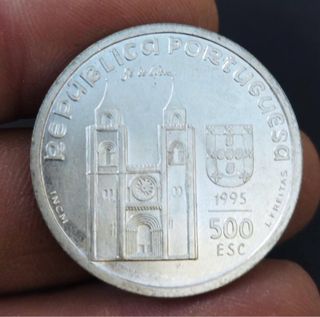 Moneta commemorativa del Portogallo da 500 Escudi dell'anno 1995. - Argento. - Design di Santo Antonio. - Dritto: SANTO ANTONIO e figura di Santo Antonio con un libro e un crocifisso. - Rovescio: 8º CENTENARIO e un design architettonico. Peso 14 grani
