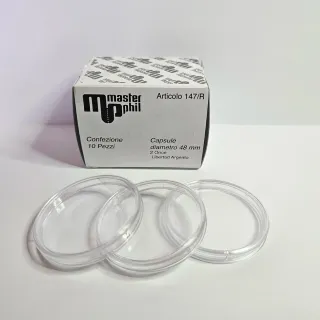 Confezione di capsule trasparenti per la conservazione di monete. - Marca: Master Phil - Articolo: 147/R - Diametro interno: 48 mm - Quantità: 10 pezzi - Adatte per monete da 2 Once Libertad Argento