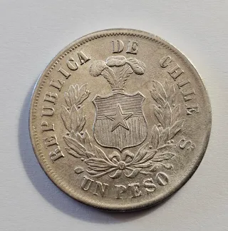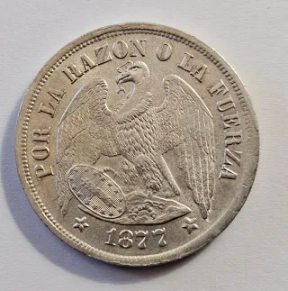 Moneta da 1 Peso cileno del 1877. - Realizzata in argento 900. - Dritto: REPUBLICA DE CHILE con stemma nazionale. - Rovescio: UN PESO con data 1877.