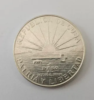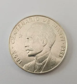 Moneta commemorativa da 1 Peso del 1953, dedicata al Centenario di José Martí.Cuba - Dritto: Ritratto di José Martí. - Rovescio: Scritta CENTENARIO DE MARTI 1853 - 1953.