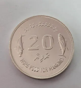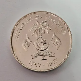 Moneta da 20 Rufiyaa delle Maldive, coniata nel 1977. - Realizzata in argento 500 ,peso grammi 28,28 ,diametro 38,61 spessore mm 2,7 - Presenta un dattero e due bandiere. - Dettaglio della scritta REPUBLIC OF MALDIVES.