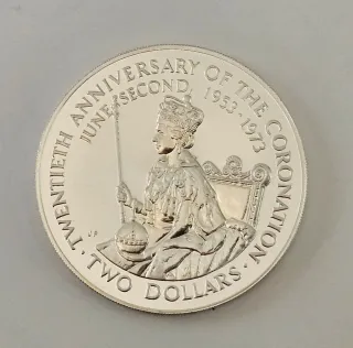 Moneta commemorativa delle Isole Cook da 2 dollari del 1973. - Celebra il ventesimo anniversario dell'incoronazione della Regina Elisabetta II. - Raffigura la Regina Elisabetta II seduta sul trono con lo scettro e il globo. - Dritto: TWENTIETH ANNIVERSARY OF THE CORONATION, JUNE SECOND 1953 - 1973, JB, TWO DOLLARS. - Rovescio: (Non visibile nell'immagine fornita).Pesa grammi 25,7 argento 0,925