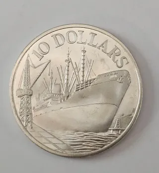 Moneta da 10 Dollari di Singapore del 1976, realizzata in argento. Raffigura una nave mercantile e delle gru in un porto. - Materiale: Argento titolo 500,ha un peso di grammi 31,10,e un diametro di mm40 - Anno: 1976 - Valore nominale: 10 Dollari - Paese: Singapore