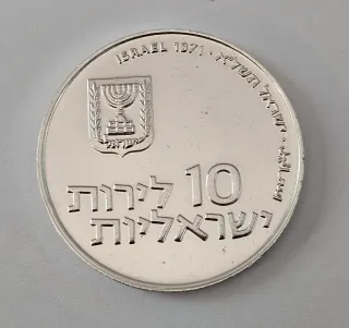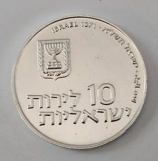Moneta da 10 Lirot dello Stato di Israele, anno 1971. Argento 900 ,Peso grammi 26,00 mm37, - Emblema dello Stato di Israele. - Scritta ISRAEL 1971 in inglese. - Scritta in ebraico e arabo.