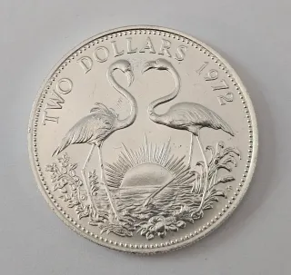Moneta da 2 Dollari delle Bahamas del 1972, realizzata in argento 0,925 prodotta dalla Franklin Mint ,peso grammi 29,8 ,diametro di 40 mm - Raffigura due fenicotteri con un sole al tramonto sullo sfondo. - Anno di conio: 1972. - Materiale: Argento.