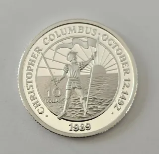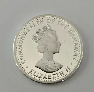 Moneta commemorativa delle Bahamas del 1989. - Valore nominale: 10 Dollari Argento 925 ,peso grammi 28,28 diametro 38,61 mm - Tema: Cristoforo Colombo - Data: Ottobre 12, 1492 - Anno di conio: 1989