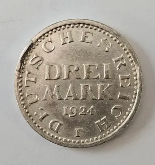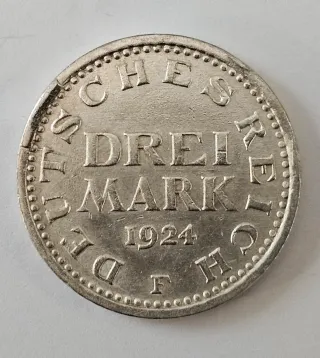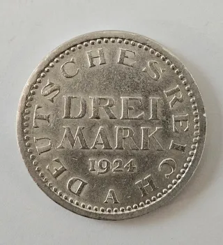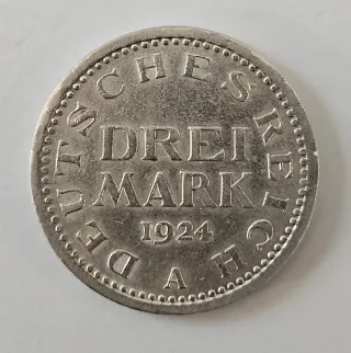 Moneta da 3 Marchi coniata nel 1924. È un emissione della Repubblica di Weimar(Germania)coniata nella zecca di Stoccarda simbolo F,argento 500 con peso di 15 grammi,diametrodi circa 33 mm - Dritto: Aquila imperiale tedesca. - Rovescio: Valore DREI MARK e anno 1924. - Zecca: F (Stoccarda).
