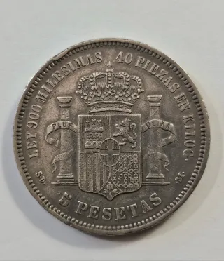 Moneta da 5 Pesetas di Spagna del 1871, con l'effigie di Amedeo I. Argento originale Peso grammi 24 ,7 - Dritto: Ritratto di Amedeo I di Savoia. - Rovescio: Stemma della Spagna. - Anno: 1871.