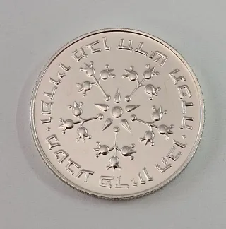 Moneta da 10 Lirot d'Israele in argento del 1967. - Dritto: Raffigura un ramo di ulivo e la scritta ISRAELE in ebraico. - Rovescio: Presenta il valore 10 Lirot e l'anno 1967 in ebraico, con un disegno stilizzato di un ramo di palma.