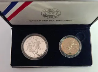 Set di due monete commemorative in argento 900 ,peso gr 26,73,diametro mm 38, 1.Mezzo Dollaro:rame-nikel,peso gr 11,34 ,diametro mm 30,61 per la Coppa del Mondo FIFA USA 1994. - Moneta da un dollaro d'argento. - Moneta da mezzo dollaro in Rame - Nikel - Design a tema calcistico.