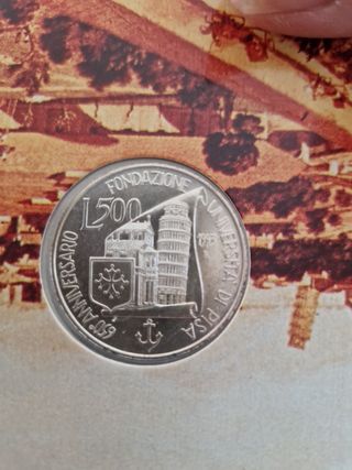 Vendo moneta argento 835 15 grammi L.500 del 1993 celebrativa del 650esimo anniversario dell'istituzione dell'Università di Pisa. Pr3sente un residuo di etichetta sull'astuccio come da fotografia