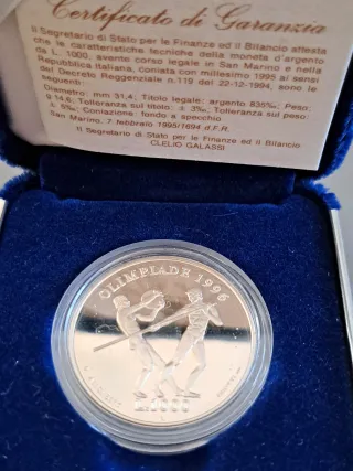 Moneta in argento da 1000 Lire di San Marino, coniata nel 1995 in occasione delle Olimpiadi. - Titolo legale: argento 835%. - Diametro: 31,4 mm. - Peso: 9,14,6 g. - Coniazione: fondo a specchio.