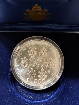 Moneta da 500 Lire in argento della Città del Vaticano, coniata nel 1999 per celebrare il 70° anniversario. - Anno di coniazione: 1999 - Valore nominale: 500 Lire - Metallo: Argento - Tema: 70° anniversario