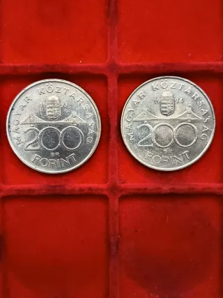 Due monete da 200 Fiorini d'Ungheria, coniate nel 1992 e nel 1994. Rappresentano il ponte e lo stemma nazionale. - Dritto: MAGYAR KOZTARSASAG, ponte, stemma, anni 19 92 o 19 94, 200 FORINT. - Rovescio: MAGYAR KOZTARSASAG, ponte, stemma, anni 19 93 o 19 94, 200 FORINT.