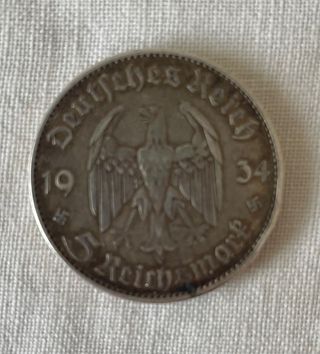 Moneta da 5 Reichsmark del 1934. - Dritto: Aquila imperiale tedesca. - Rovescio: Valore 5 Reichsmark e anno 1934. - Metallo: Argento.