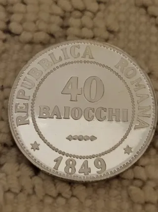 Medaglia commemorativa in argento 999, coniata nel 1849. - Dritto: REPUBBLICA ROMANA con al centro 40 BAIOCCHI e decorazioni. - Rovescio: 1849 con stelle e decorazioni. - Materiale: Argento 999. 25 grammi