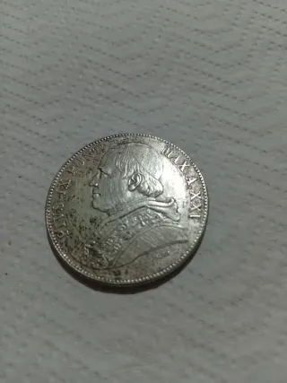Moneta in argento da 5 Lire. - Effigie di Papa Pio IX. - Anno 1870 (corrispondente al 1870). - Dritto con iscrizione PIVS IX PONT MAX A X XI.
