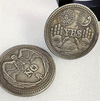 Particolare moneta decisionale Si - No Misure descritte in foto Portafortuna destino scelta indecisione scaramanzia superstizione souvenir Materiale: Metallo Stampata fronte retro con attenzione ai dettagli in rilievo 3D Colore argento anticato / argentato antico stile invecchiato Doppio lato Yes - No / Si - No Decisione Indecisione fortuna Amuleto Talismano Skull Teschio Stile barocco veneziano. Collezione collezionismo ornamento numismatica Ottima idea regalo Uomo / donna Scheletro Mani Illuminati Massonico Massoneria Vintage Triangolo Triade simbolo Trinità Occhio che tutto vede,Terzo occhio mano punk emblema magia Nuovo