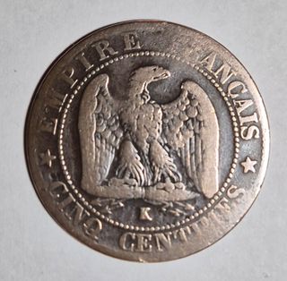Moneta da 5 centesimi di bronzo della Francia, coniata nel 1863. - Dritto: Ritratto di Napoleone III. - Rovescio: Valore nominale e anno di coniazione. - Zecca: K (Rara). - Materiale: Bronzo.