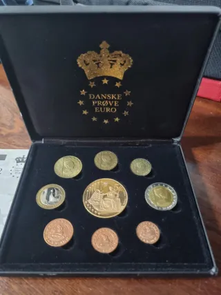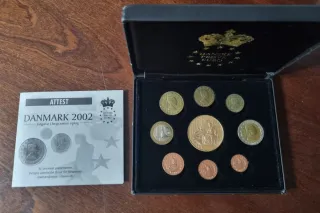 Cofanetto di monete prova euro della Danimarca del 2002. Contiene varie monete. Design della corona danese e stelle sul coperchio. Monete di diversi valori e metalli.