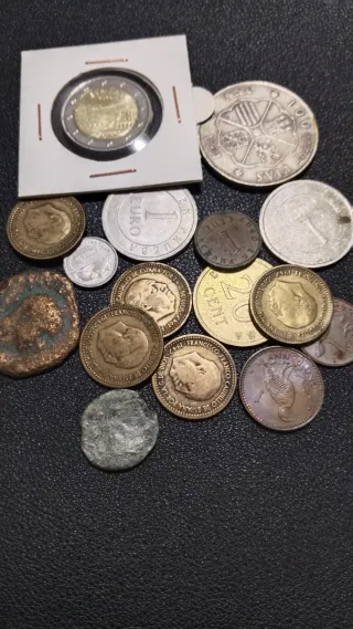 Set di monete di diversi paesi ed epoche. - Monete Euro commemorative Città Monumentale di Cáceres non circolante. Euro di prova. - Monete Peseta. - Una moneta possibilmente Romana. - Moneta commemorativa di Francisco Franco. - Moneta di Trinidad e Tobago del 1975. - Moneta con ritratto della Regina Elisabetta II...ecc.