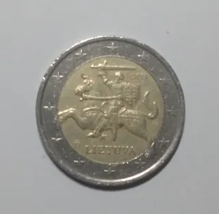 Moneta da 2 euro commemorativa della Lituania, coniata nel 2015. - Dritto: Vytis (il Cavaliere), simbolo nazionale lituano. - Rovescio: Valore nominale e mappa dell'Europa. - Anno di coniazione: 2015.