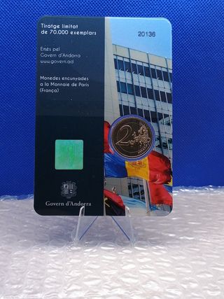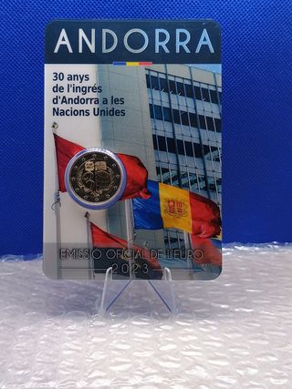 Moneta da 2 euro commemorativa di Andorra, in card, dedicata al 30° anniversario dell'ingresso del paese alle Nazioni Unite. Tiratura limitata a 70.000 esemplari. - Coniata dalla Monnaie de Paris. - In perfette condizioni, come da foto. - Emessa nel 2023..