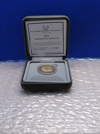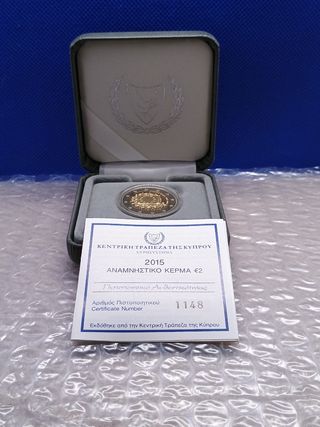 Moneta commemorativa da 2 euro di Cipro del 2015, in qualità proof. La moneta presenta la bandiera europea. - Moneta in condizioni impeccabili. - Confezione originale inclusa. - Numero di certificato: 1153
