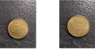 Moneta da 50 centesimi di euro, coniata in Grecia nel 2002. Raffigura il volto di Eleftherios Venizelos. Considerata rara perché coniata in Francia per la Grecia - Anno di coniazione: 2002 - Paese: Grecia - Valore nominale: 50 centesimi di euro - Dritto: Ritratto di Eleftherios Venizelos - Rovescio: Mappa dell'Europa con le stelle dell'Unione Europea