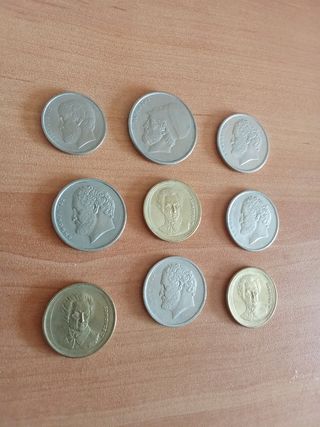 Set di 9 monete greche. - monete da 5, 10 e 20 dracme - Vari design con simboli ed edifici greci.
