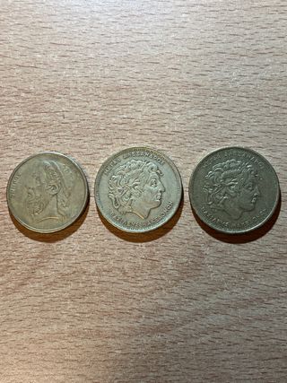 Set di monete greche con diversi design. - Moneta con ritratto di Konstantinos. - Moneta con ritratto di Georgios Karaiskakis. - Moneta con gufo e il numero 1. - Moneta con ritratto di Alessandro Magno. - Moneta con ritratto di un uomo con elmo. - Moneta con ritratto di un uomo con barba. - Moneta con ritratto di un uomo con berretto. - Moneta con ritratto di un uomo di profilo. - Moneta con il numero 20 e foglie. - Moneta con ritratto di un uomo di profilo e l'anno 1968.
